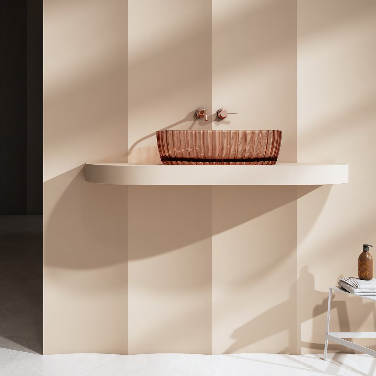 Die Transparent Series von BeWater verbindet filigrane Ästhetik mit modernster Fertigungskunst. Das transluzente Polyresin lässt Licht sanft durchscheinen und verleiht dem Waschtisch eine schwebende, fast gläserne Leichtigkeit.