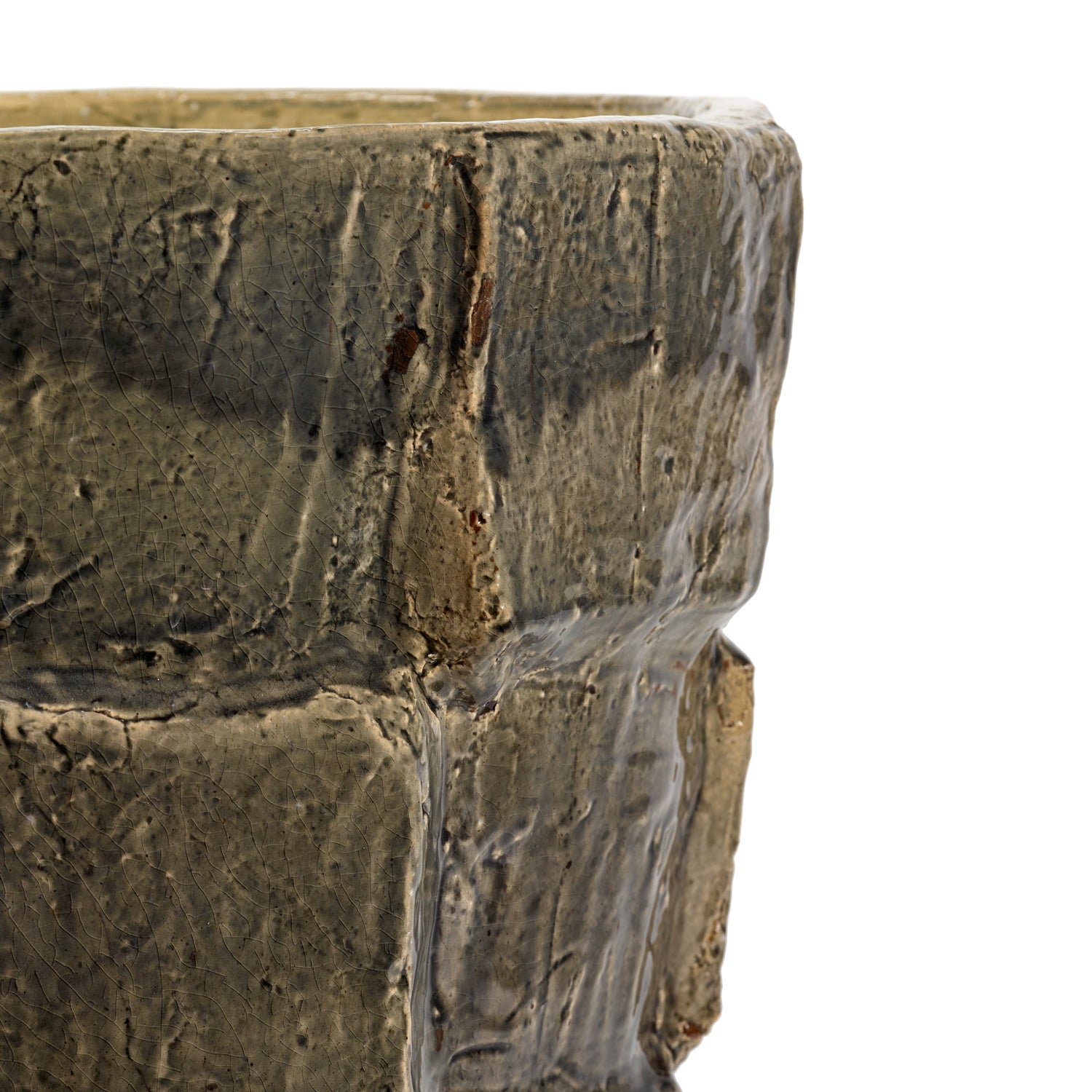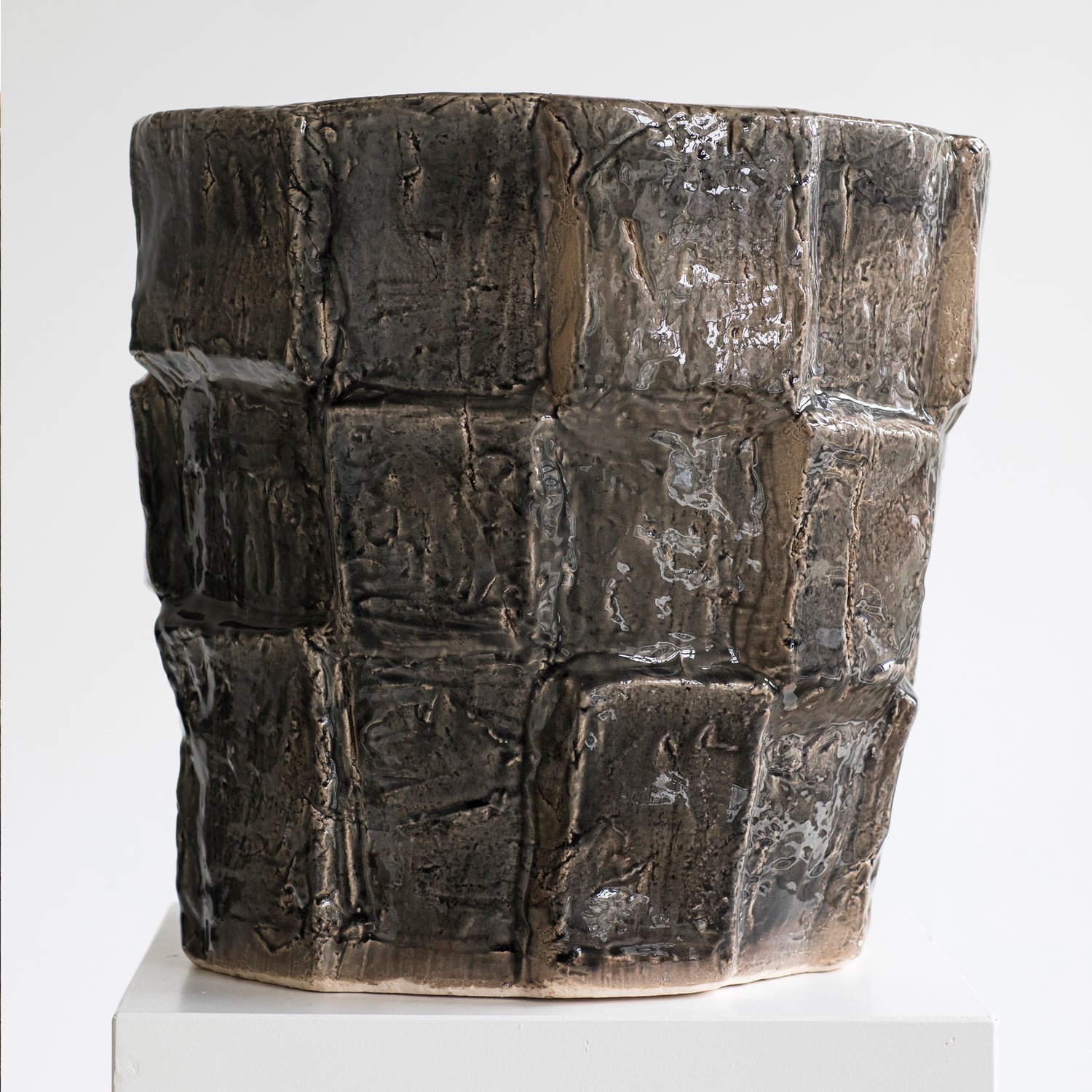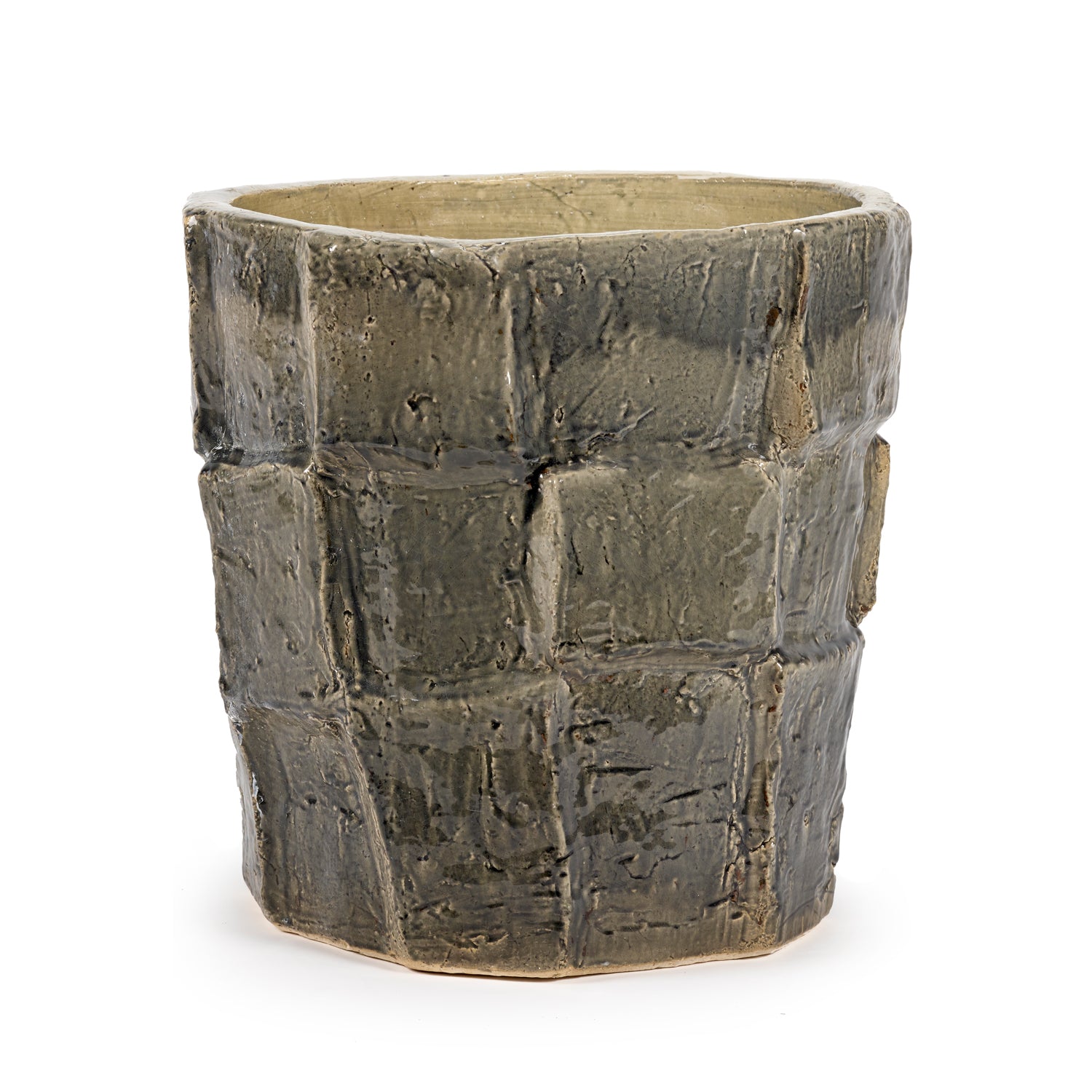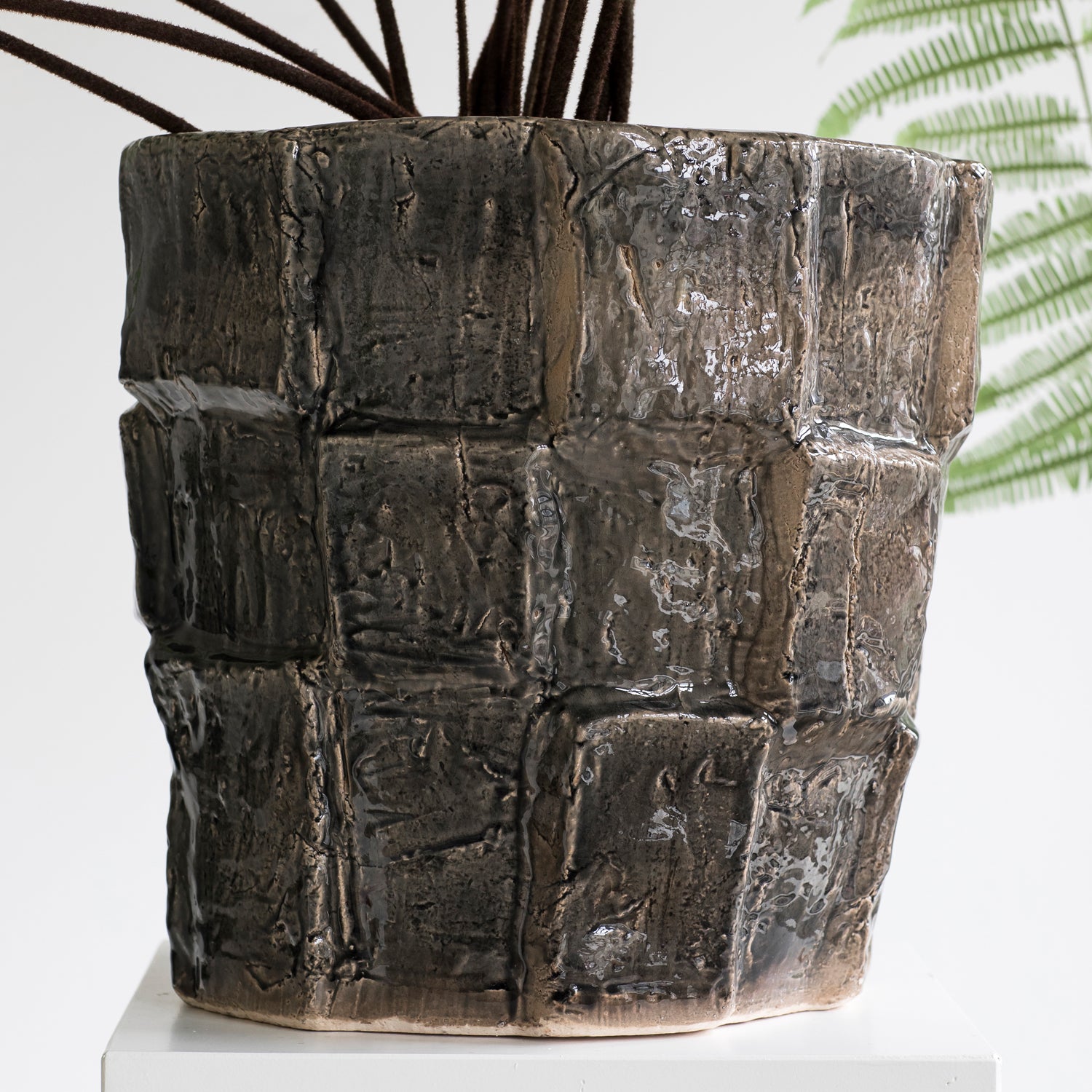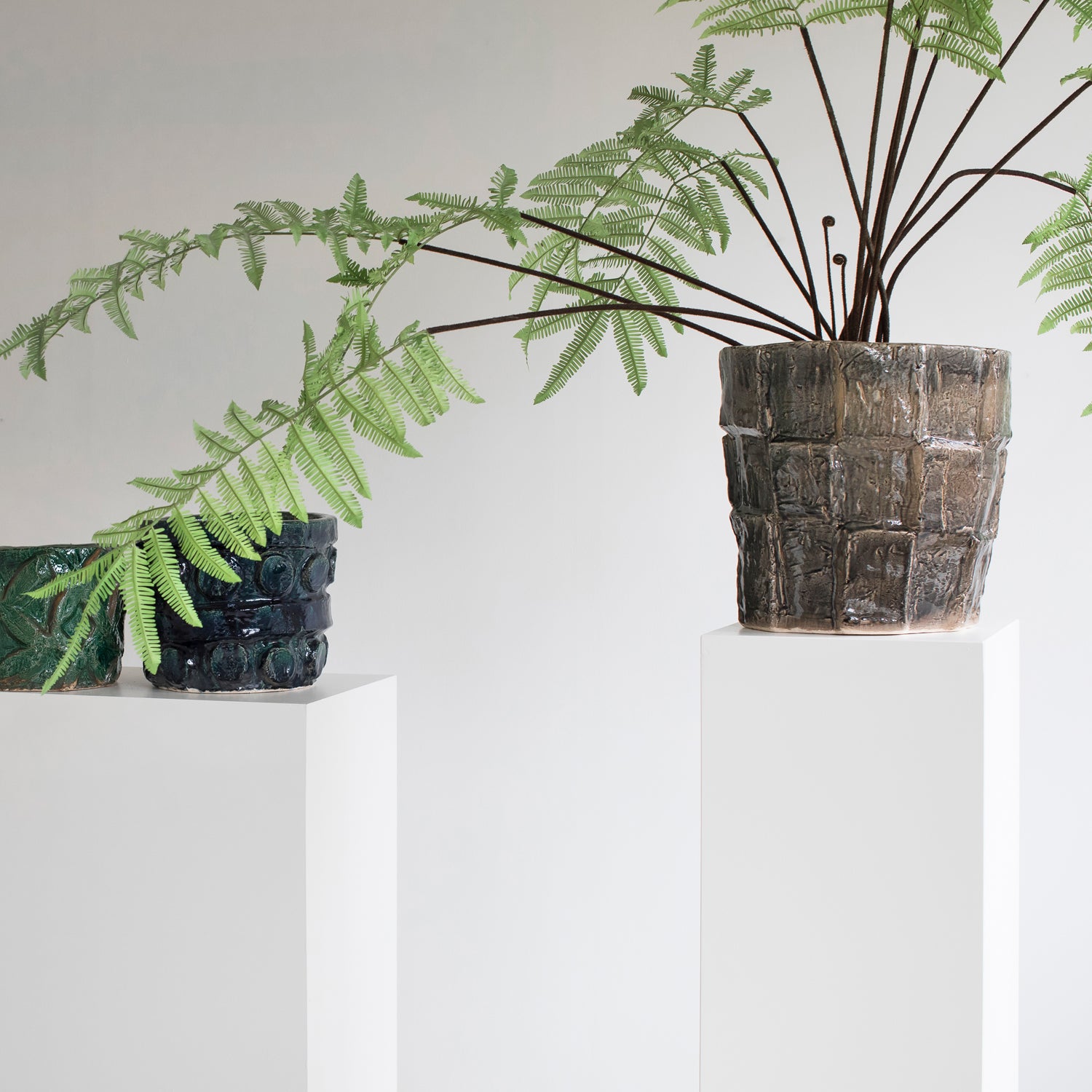 Les formes géométriques et le relief répétitif aident le jardinière gris foncé de Bela Silva à son charisme minimaliste. Afin de ne pas interrompre l'objet, ce débordement n'a pas de trou, pourrait s'écouler sur l'eau.