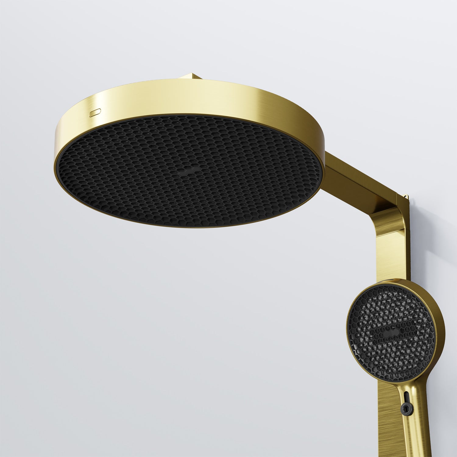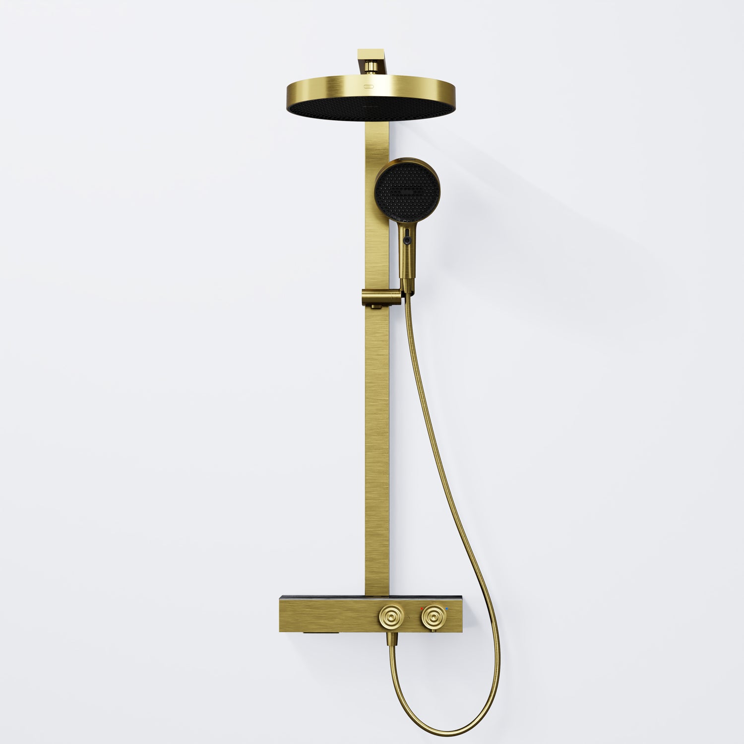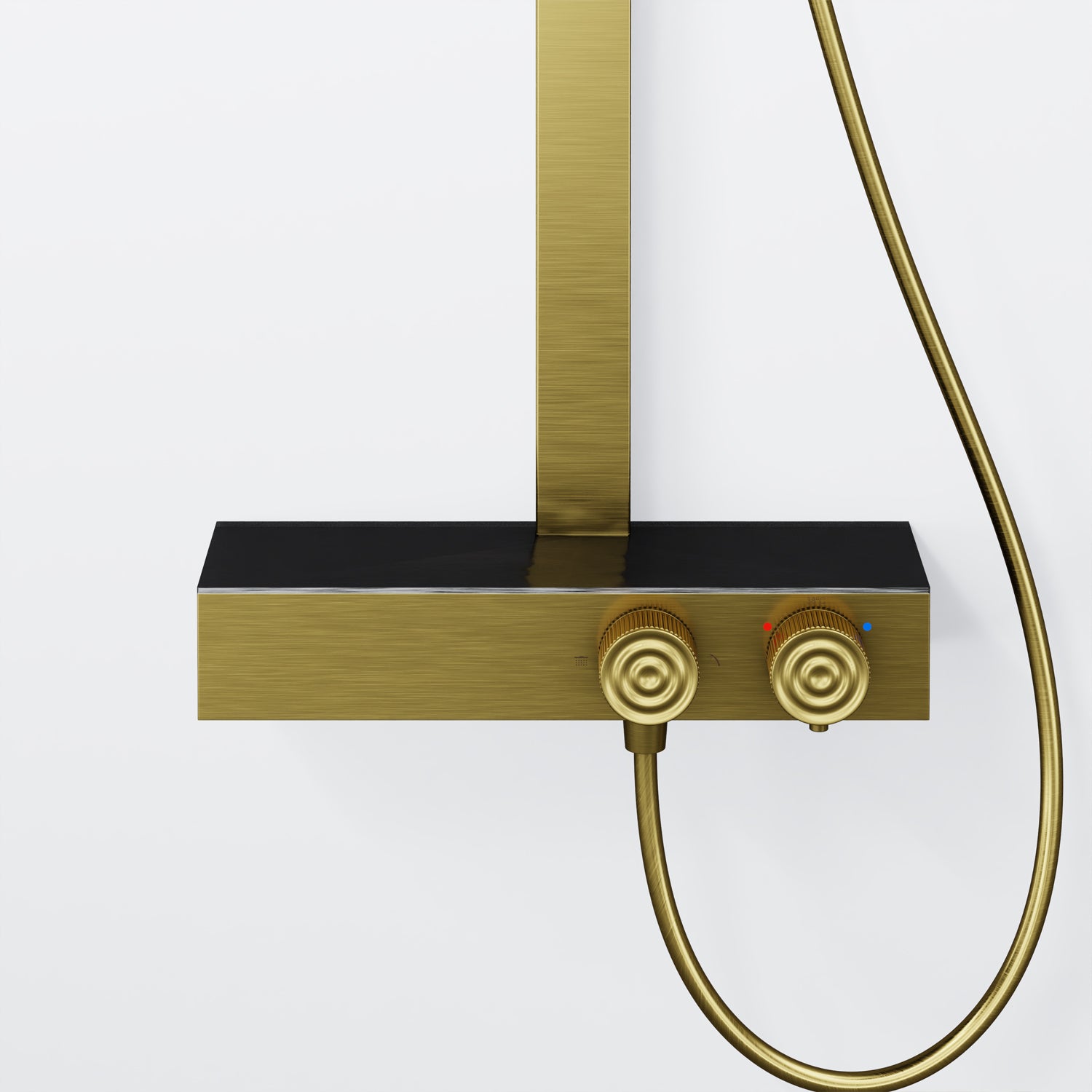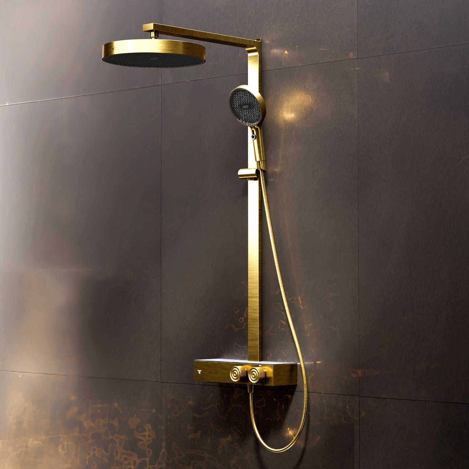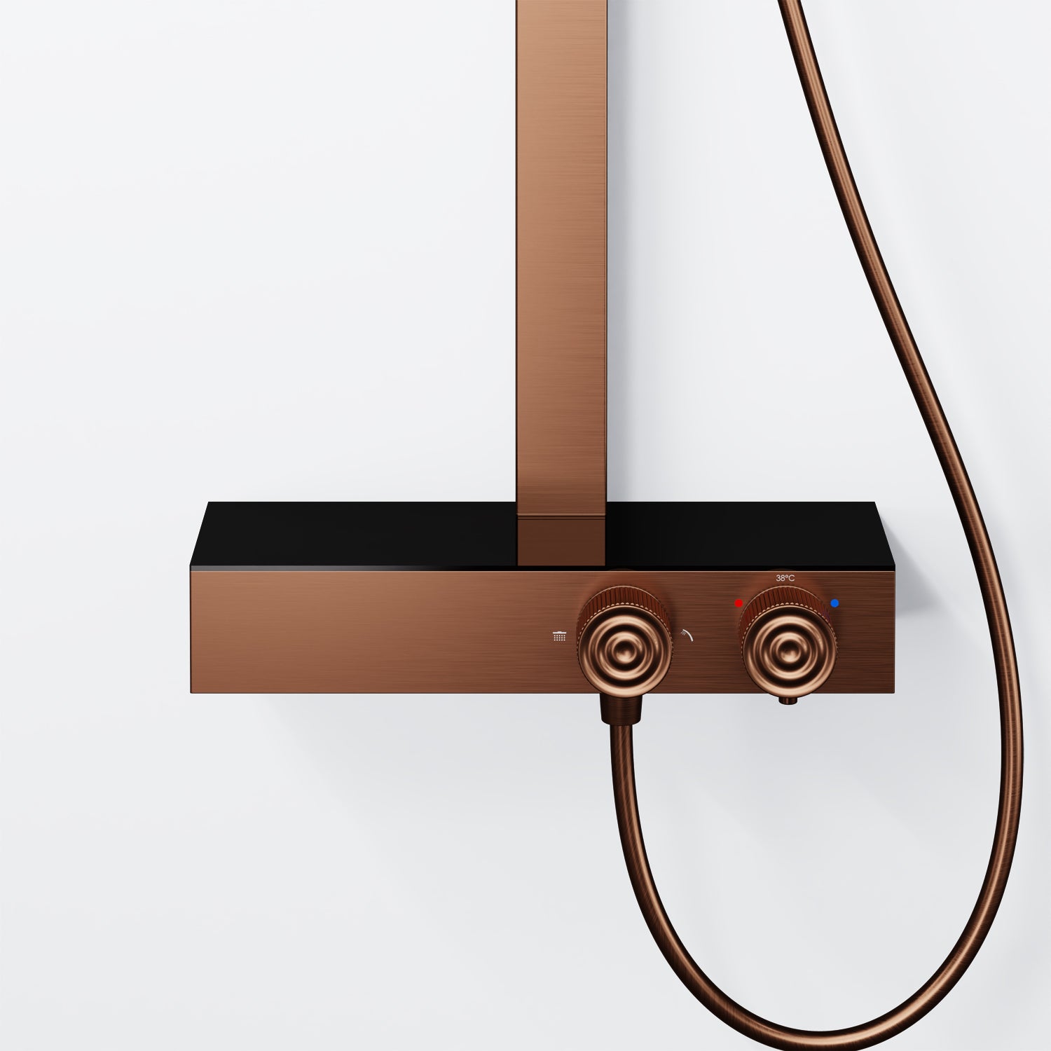Steinberg Duschsystem mit Glasablage, Thermostat mit Drehknöpfen, Regenbrause und Stabhandbrause , Brushed Copper