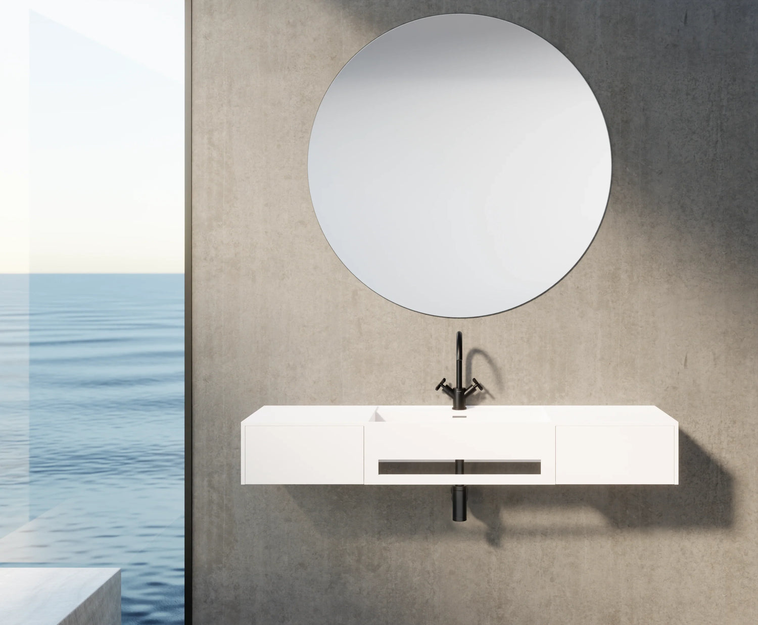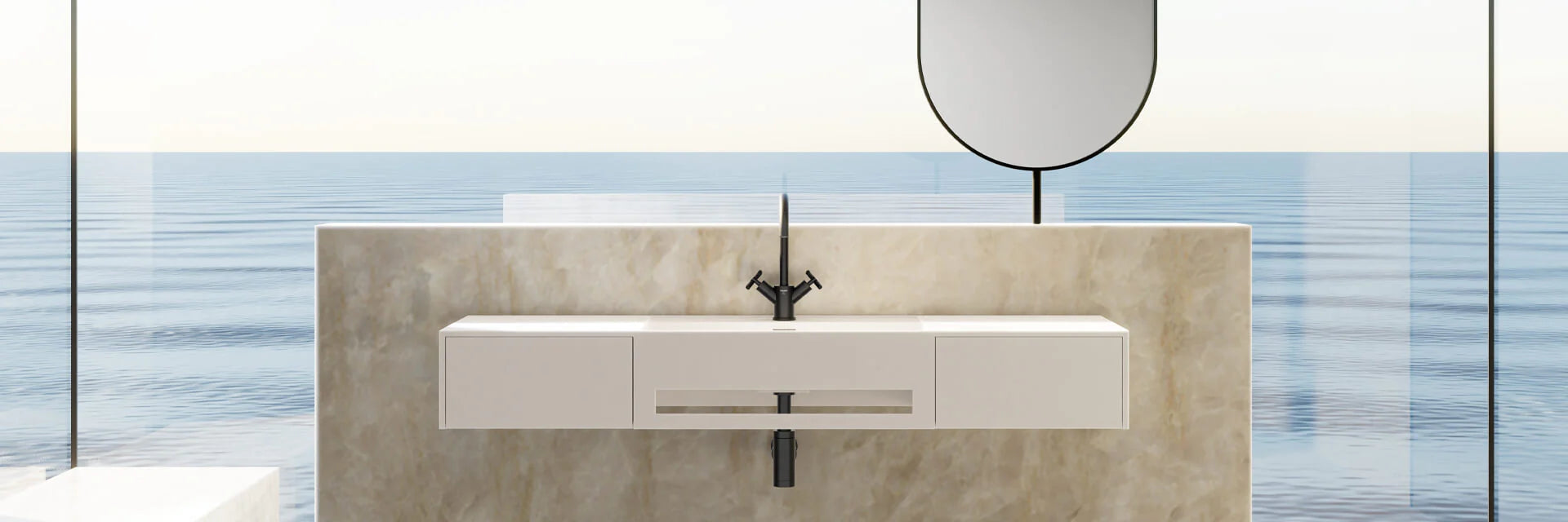 Das schlichte und dennoch zeitgemäße Design der Waschtische passt perfekt zu der makellosen, matten Oberfläche, die dem Raum eine besondere Ausstrahlung verleiht. Dieses Ergebnis ist das Produkt eines gestalterischen Zusammenspiels, das aus Leidenschaft und einem klaren ästhetischen Anspruch entsprang. Die Solid Surface-Collection bietet eine breite Auswahl an individuell gestalteten Waschtisch-Designs, bei denen jedes Detail sorgfältig ausgearbeitet wurde, um nicht nur funktional, sondern auch ein Erlebnis zu sein.