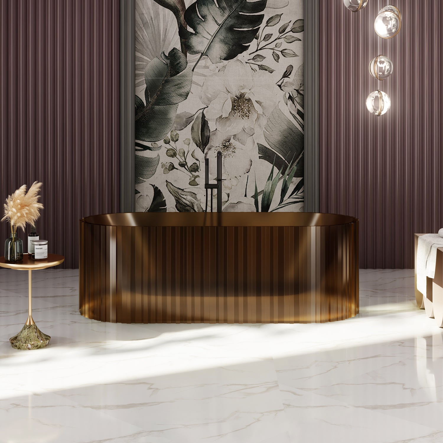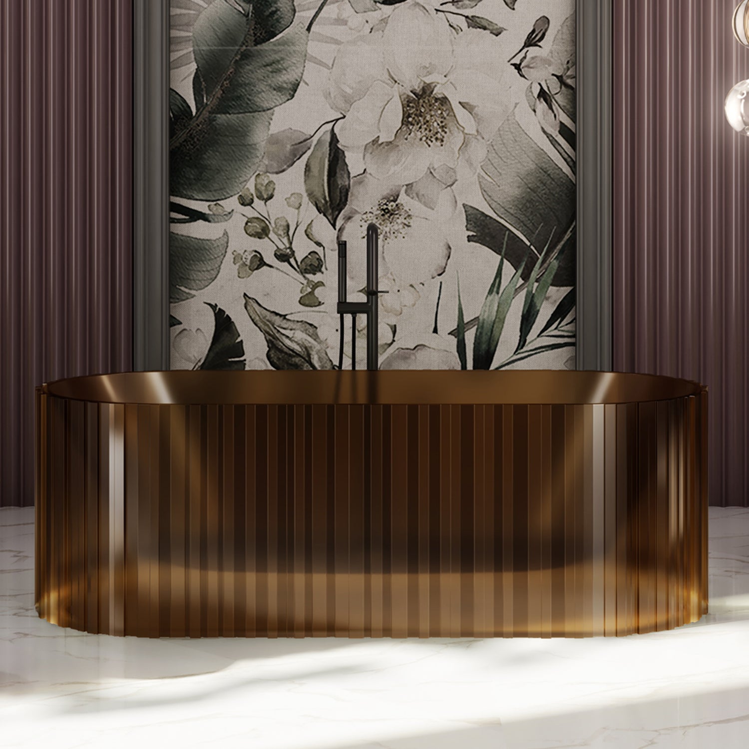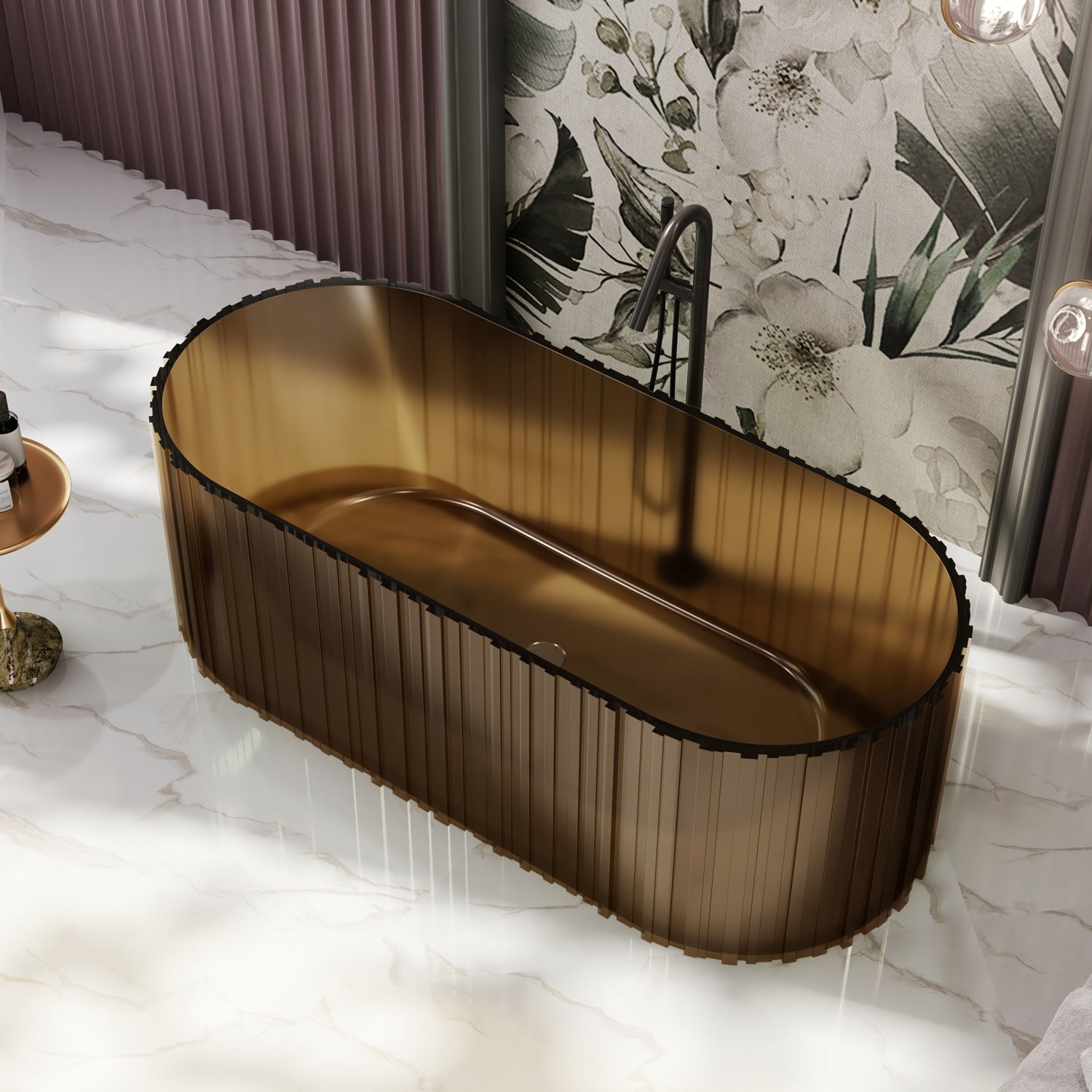 Diese luxuriöse freistehende Badewanne vereint modernes Design mit hochwertiger Verarbeitung. Mit ihrer einzigartig strukturierten Oberfläche aus durchgefärbtem Polyresin sorgt sie für eine stilvolle und zugleich natürliche Raumwirkung. Die transluzente Materialität verleiht der Wanne Tiefe und Eleganz – je nach Licht entsteht ein faszinierendes Spiel aus Farbe und Transparenz.