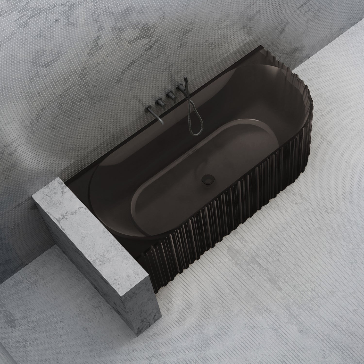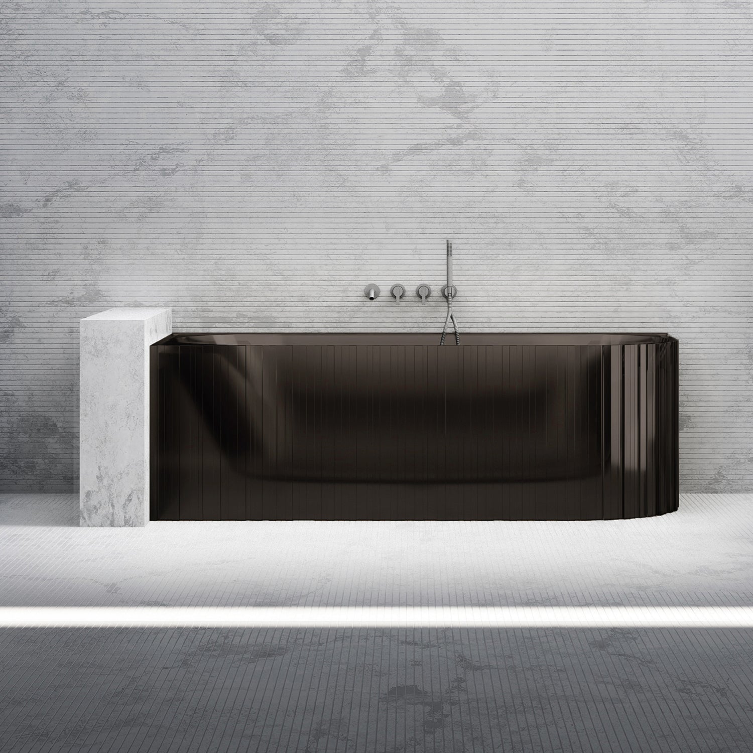 Bewater Eck-Badewanne links, mit vertikaler Außenstruktur, aus Polyresin, ohne Überlauf inkl. Ablaufgarnitur - grau