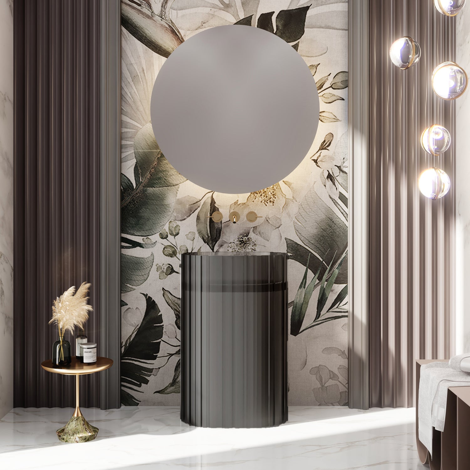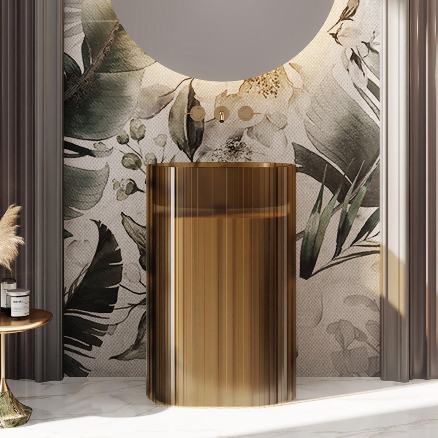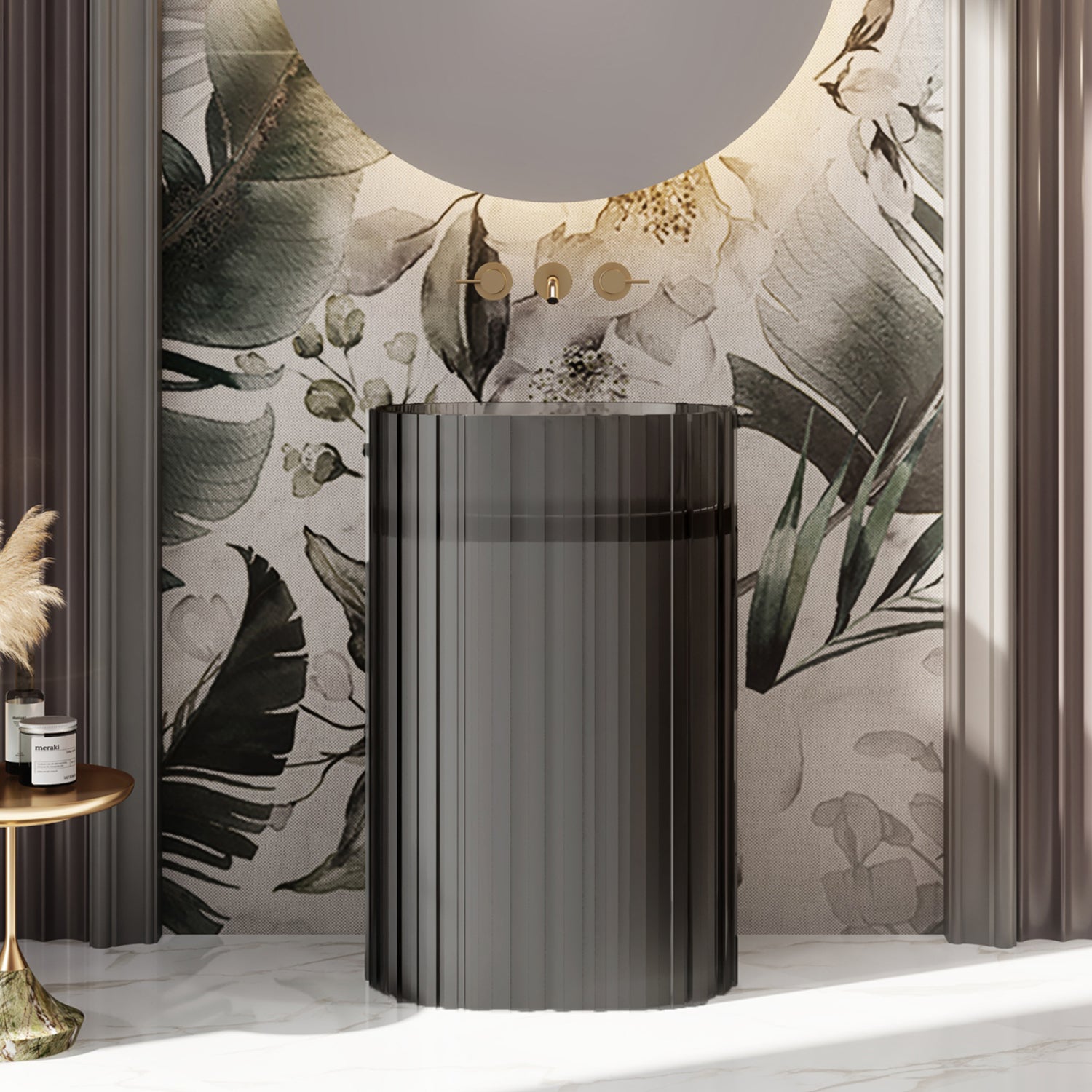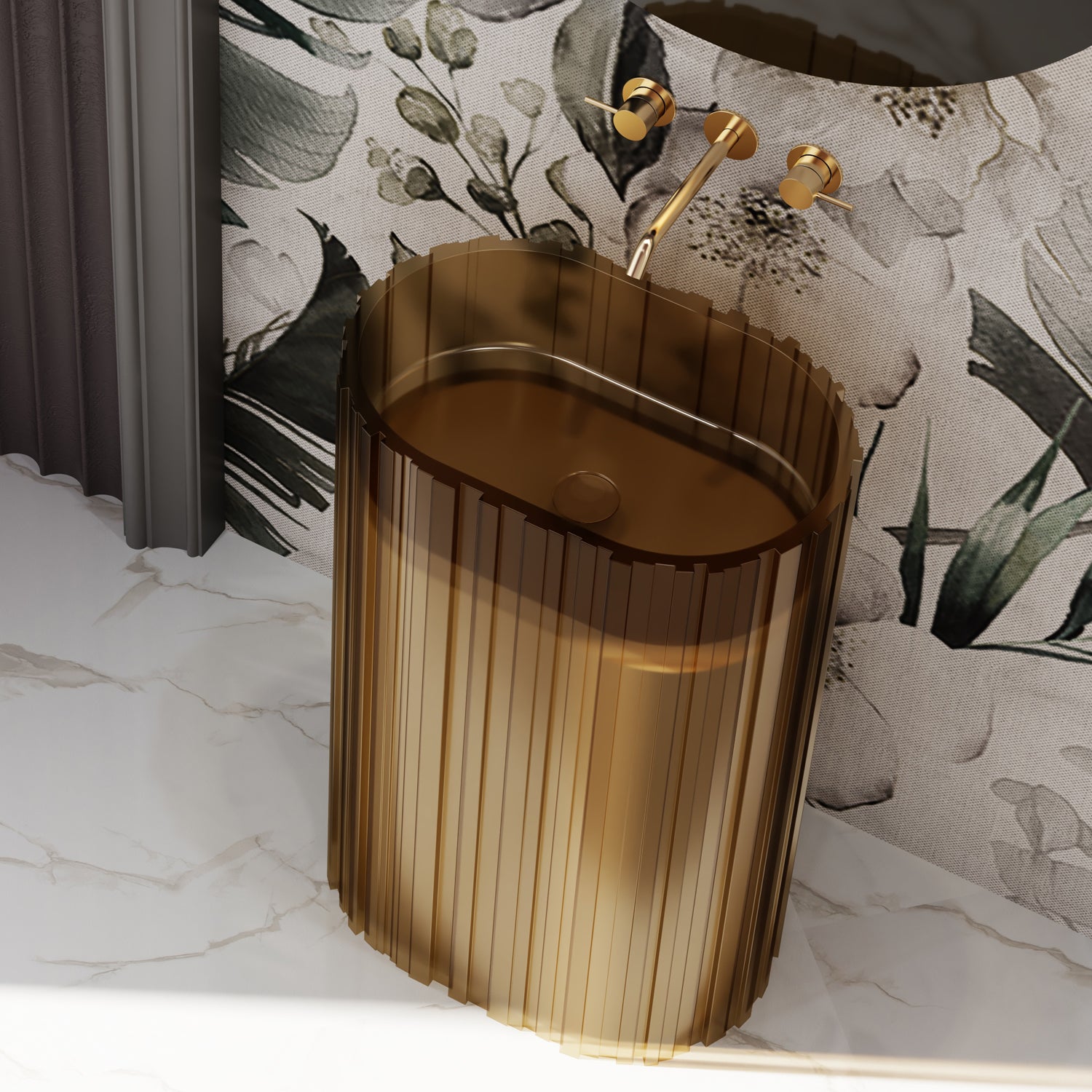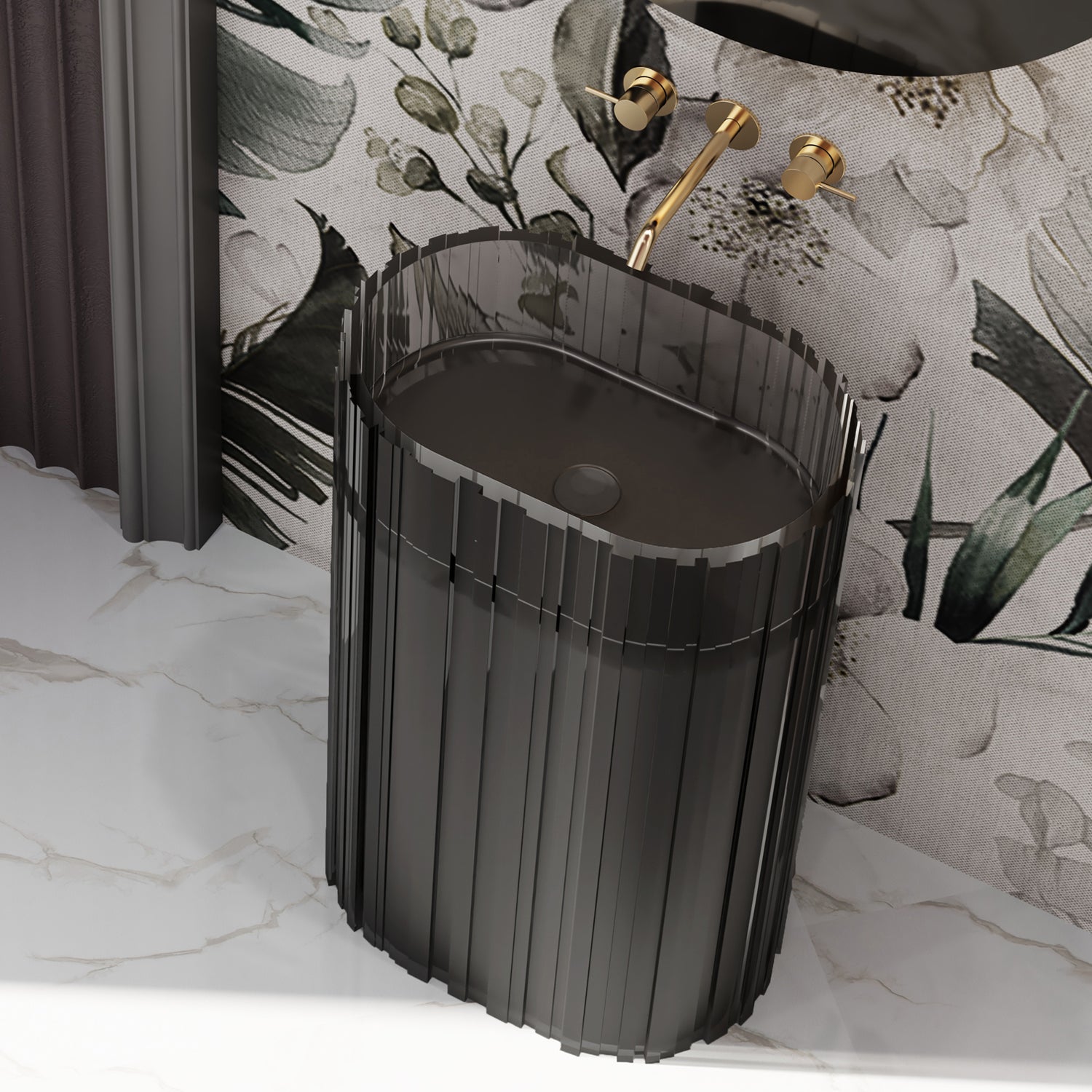 Dieser freistehende Design-Standwaschtisch aus edlem Polyresin vereint skulpturale Wirkung mit funktionaler Ästhetik. Die vertikale Strukturierung und die transluzente Oberfläche sorgen für einzigartige Lichtreflexe – ein wahres Highlight für jedes stilvolle Bad.