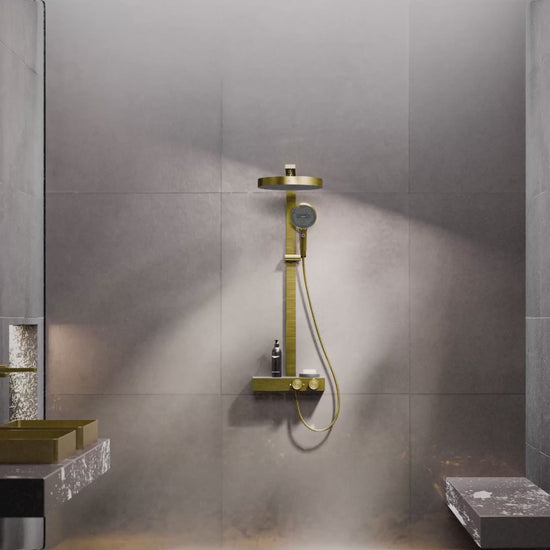 Steinberg Duschsystem mit Glasablage für 3 Verbraucher - Thermostat mit Drehknöpfen, Regenbrause, Handbrause & integriertem Schwallauslauf - Brushed Gold