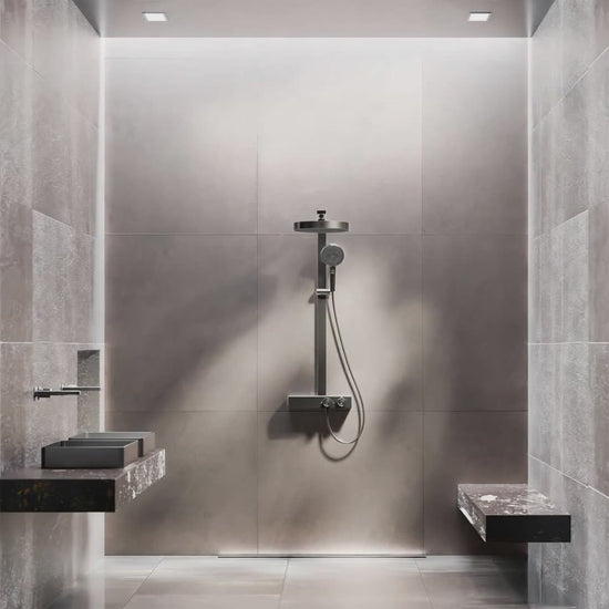 Steinberg Duschsystem für 3 Verbraucher (Kopfbrause, integrierter Schwallauslauf & Handbrause) mit Brausethermostat und großzügiger Ablage aus Sicherheitsglas.